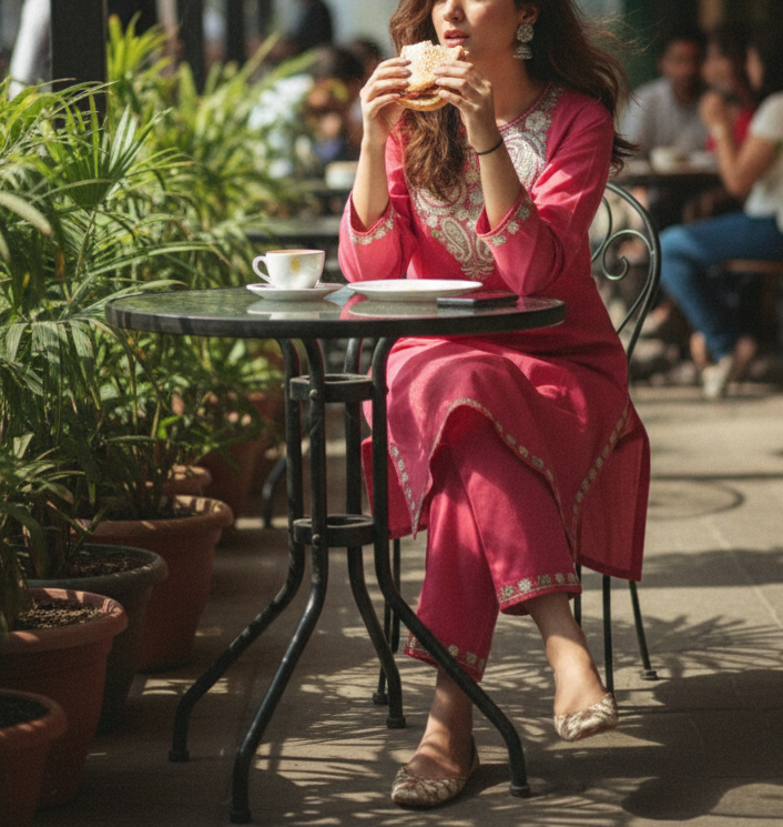 - Colour – Coral Rose Coord Set with Beige Aari Embroidery