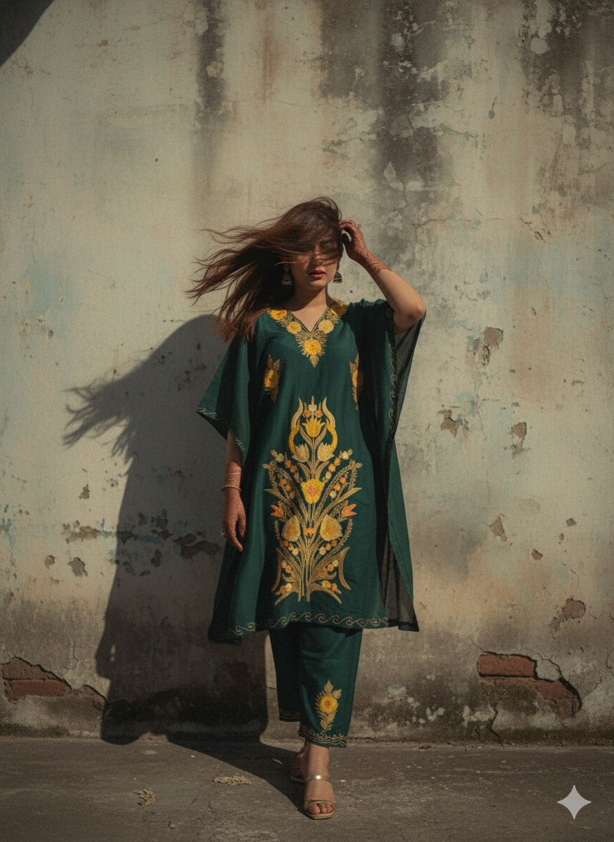 - Styling Recommendations – Elevate your style with this handcrafted kaftan set by pairing it with minimal, elegant jewelry to highlight the detailed embroidery. Add a structured sling bag or chic backpack for a contemporary twist. Complete the outfit with embellished juttis, classic stilettos, or slip-on sandals — perfect for ethnic occasions, festive events, or elegant street-style looks.