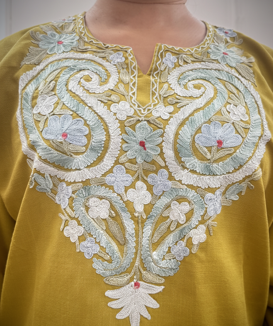 - Fit – Crafted from breathable cotton with authentic Kashmiri embroidery. Kurti with notched neckline & full sleeves, paired with matching pants for style & comfort.