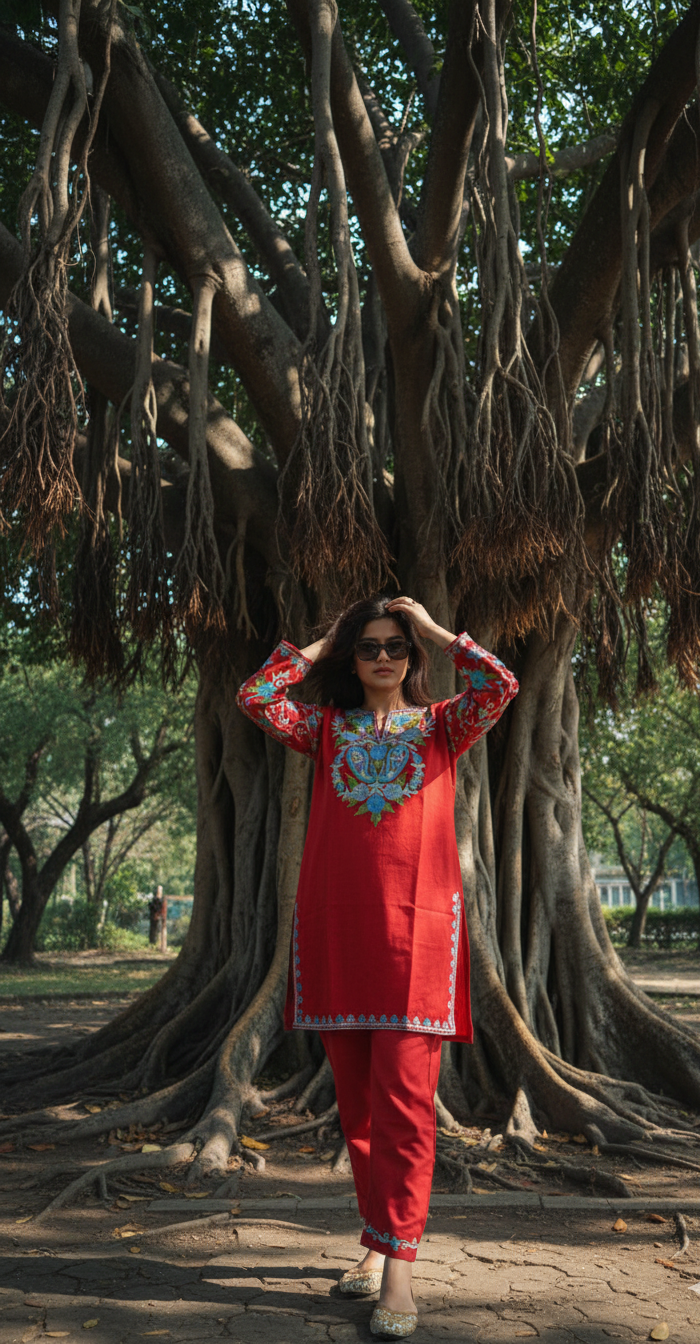 - Fit – Crafted from breathable cotton with authentic Kashmiri embroidery. Kurti with notched neckline & full sleeves, paired with matching pants for style & comfort.